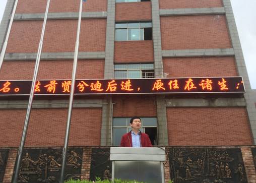 此次大会主持人是来自K470班的刘一澎。大会第一项,由来自K447班的 为我们介绍本周旗手,他们品学兼优,积极向上,是每一位同学学习的榜样。大会第二项,升国旗校旗,奏国歌校歌。伴着歌声的响起,同学们全体肃立,凝视着国旗,自信豪迈地唱响国歌校歌,五星红旗也折射着太阳的光芒。大会第三项,由社团联盟办公室干事K456班的金川玉作爱心义卖主题演讲,同时也在万象更新之中为大家介绍了中华传统节日——清明节。大会第四项,教育处蒋灿强主任细心总结上周情况,对不足之处进行批评指正,也对同学们表现优异之处大力表扬,同时布置下周工作。