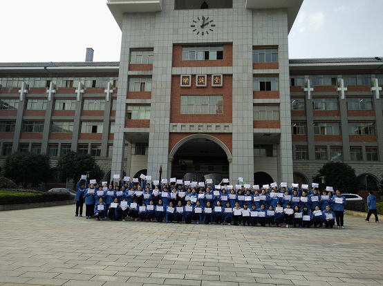 接着,刘老师对百日誓师的准备工作进行了布置,并号召学生会全体成员为高三学长学姐送上祝福。最后学生会的全体成员一齐站在乐诚堂前举着自己手中的祝福,呐喊着“校团委祝明德中学高考2017加油!”而本次会议也在呐喊中落下帷幕。