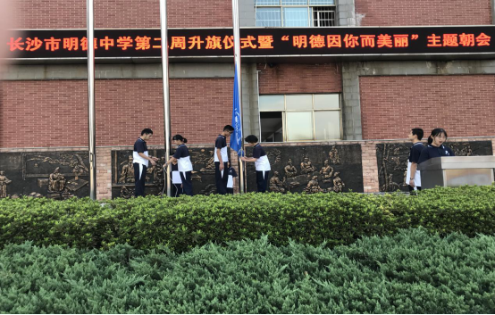 在K428班五名旗手的准备下,国旗校旗缓缓升起,全体师生奏唱国歌校歌,并行注目礼。