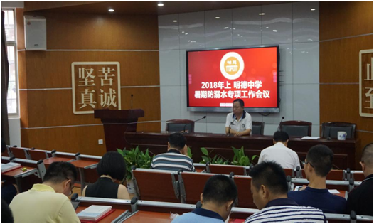 2018年7月9日上午,我校召开防溺水专项工作会议,迅速落实教育局关于预防溺水工作会议精神。主管德育安全的陶旅枫副校长主持会议,全体班主任、德育老师参加了会议。陶校长先通报了近日发生的几起学生溺水死亡事件,指出我们要高度重视学生防溺水教育宣传工作,确保类似事件不再发生,要求迅速在全??埂傲鲆弧狈滥缢ぷ鳎浞掷冒嗷?、视频观后感、班级家长群、告家长书、家校通、电访、短信、“游泳安全和防溺水宣传知识展”等形式提醒学生、家长做好防溺水工作。