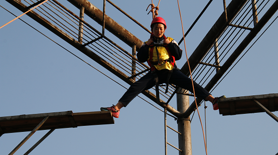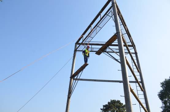 之后便是活动的开展了,首先迎来的是一场与自己的较量——高空挑战,挑战者须攀爬上十几二十米的高空,在空中,会有两块相隔一米多的木板,挑战者需从一块板子跳到另一块上,看似简单的过程却考验着每一个挑战者的心理素质,很多人都在那一米多的间隙前退却了,不敢迈出最关键的一步,但不论是谁,在下方的同学都会为他们鼓励,加油,替他们最后超越自己的一跃而鼓掌。每个挑战者都在挑战下落时大声喊出自己的梦想。既享受了在成功之后轻盈落下时耳边拂过的轻轻微风,张开双手领略了飞翔空中的感觉也感受到了团队中那点点滴滴加油所带来的温暖与自己内心对于梦想的悸动。