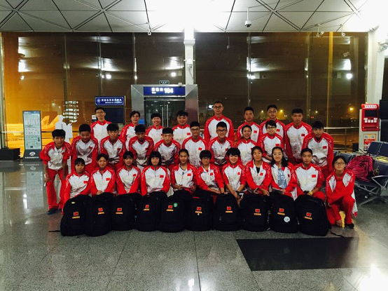 萨哈第六届少儿运动会中国代表团田径代表队在天津国际机场整装正式出发(李鹏老师担任本次田径代表队跨栏教练员,范伊豪、肖祥宇俩位同学为代表队队员)。