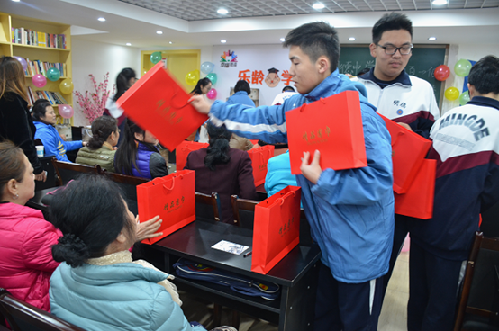 为了不再问父母要钱的“伸手一族”,明德中学的志愿者们在此之前进行了爱心义卖,所得的款项悉数用做爱心活动。这次志愿者们精心为爷爷奶奶们准备了大红色的羊毛围巾和保温杯,老人们系着新围巾心情大好,感觉自己的孙子孙女们回到了身边。