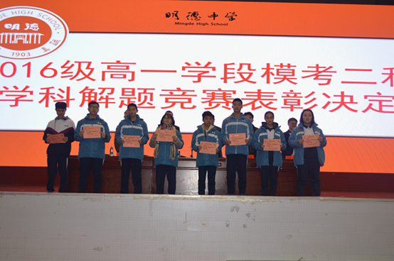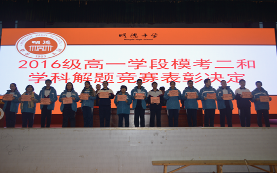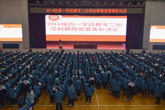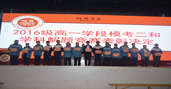 为了表彰先进、激励后进,大会首先由教务处副主任蒋灿强宣读表彰决定,表扬了李哲等30名年级学习标兵,李好等73名班级学习标兵等,廖桓萱等10名学科解题竞赛特等奖获得者并由与会领导为其颁奖。