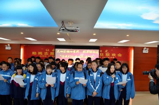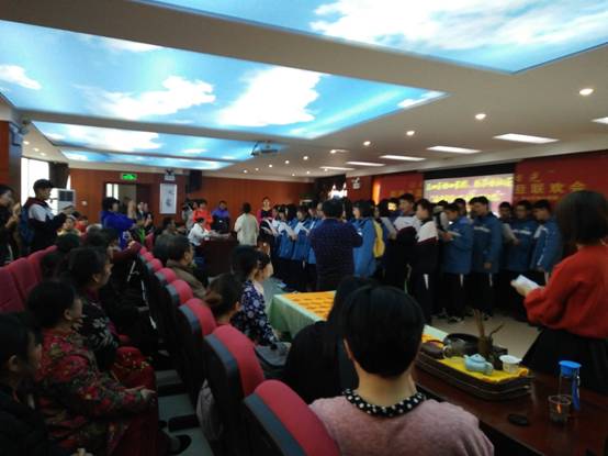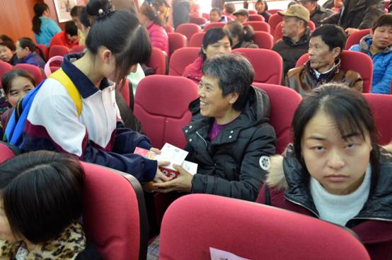 到了豹子岭社区后,在班干部的组织下,同学们井然有序地进入了会场,待K407班团支书进行完简短而又充满诚意的讲话后,节目开始。响亮的歌声在小小的会场中响起:“每一次都在徘徊孤单中坚强……”一首暖心的歌曲使现场的气氛活跃起来,在场的人们都鼓起了掌。在掌声中,同学们手拿写着自己祝福的明信片和保温杯送给了在座的残疾人士及其家属,大家脸上都洋溢着灿烂的笑容。