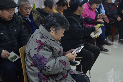 老人们看同学们的表演跟着打节拍