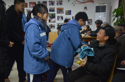 活动伊始,为了缓解志愿者与老人们彼此间的陌生感,在主持人黄粤惠同学的带领下,志愿者们依次对应一个老人,为老人们送去水果,然后做了个简单的自我介绍,和老年人们聊天,并相互给了对方一个拥抱。