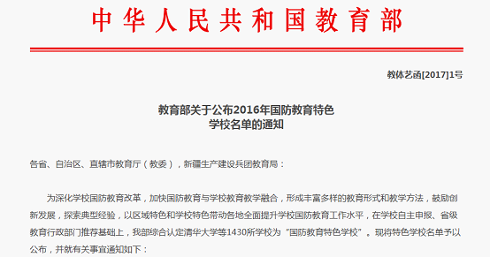 据悉,为深化学校国防教育改革,提高青少年学生综合国防素质、国家意识、国防意识和忧患意识,加快国防教育与学校教育教学融合,形成丰富多样的教育形式和教学方法,鼓励创新发展,探索典型经验,以区域特色和学校特色带动各地全面提升学校国防教育工作水平,在学校自主申报、省级教育行政部门推荐基础上,教育部日前综合认定了清华大学等学校为“国防教育特色学校”。