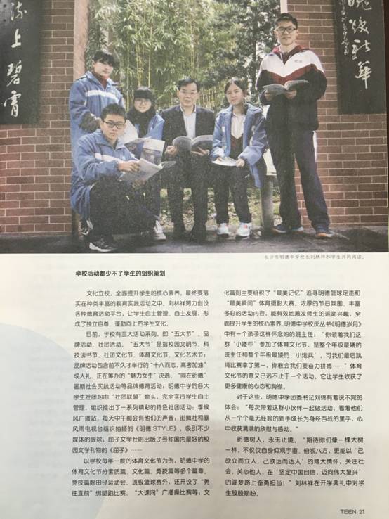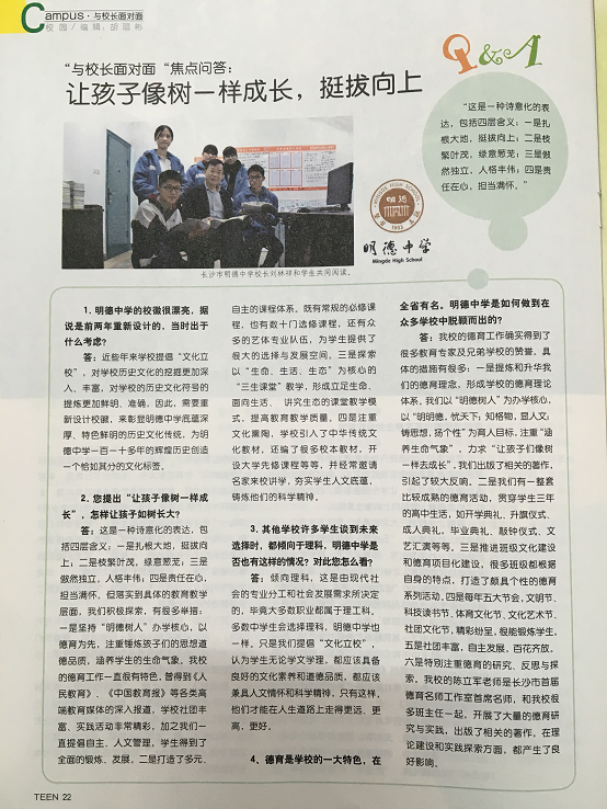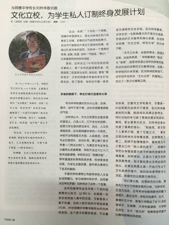 继《湖南教育》杂志(2017年2月A版)长篇专题报道我校德育文化引起广泛关注和良好反响之后,《十几岁》杂志(2017年3月)刊发报道《与明德中学校长刘林祥面对面:文化立校,为学生私人订制终身发展计划》,并配发“与校长面对面”焦点问答。