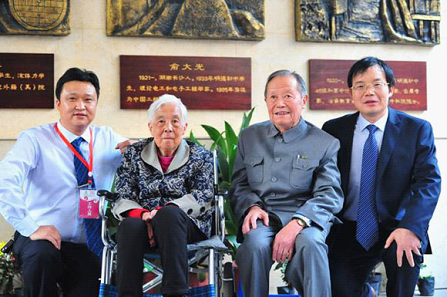 【2013年,俞大光院士及其夫人在明德院士墙与刘林祥(右一)校长合影】