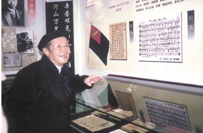 俞老参观百年校史陈列馆的情景,至今历历在目。“俞老,您上面的字还看得清吗?”百年校庆筹委会负责人陶旅枫带着调皮的口吻说。“看得清?!庇崂峡隙ǖ鼗卮??!澳切8?,您还晓得唱不?”“晓得!”此时的俞老,脊背虽有些弯曲,却精神抖擞,念出了展板的内容,读出了校歌的歌词。然后,用脚拍打着节拍,大声唱了出来“衡岳峨峨,湘流浩浩,神秀启文明……”声音洪亮,铿锵有力,节奏感特强,有如军人整齐的步伐。陪同的陶旅枫、裴洪斌、袁伟等老师油然而生敬意!既佩服俞老的记性,佩服俞老的精神,也可见《明德校歌》对人的影响之深,简直入骨了!