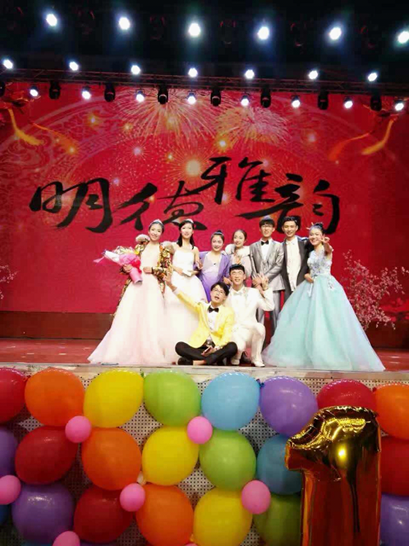 谢思琦同学(左一)主持明德教育集团2017年“明德雅韵”元旦文艺汇演后与小伙伴们合影