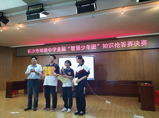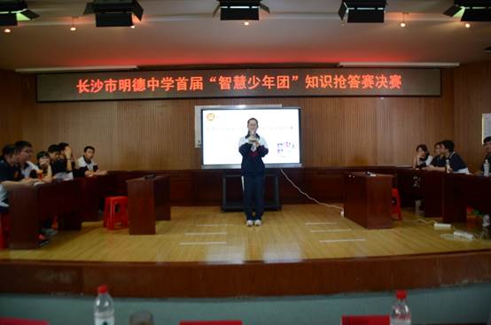 阳光正好,微风不燥。在这个风和日丽的美好日子里,在紧张激烈的初复赛之后,我们迎来了长沙市明德中学“智慧少年团”知识抢答赛决赛。本次比赛于5月11日中午12点50在明德讲堂举行,主持人是团委学生会办公室来自K412班的黄阳珍。同时,我们有幸邀请到了党委书记徐林,副校长陶旅枫,纪委书记周喜兰,副校长伍卓林出席本次比赛。