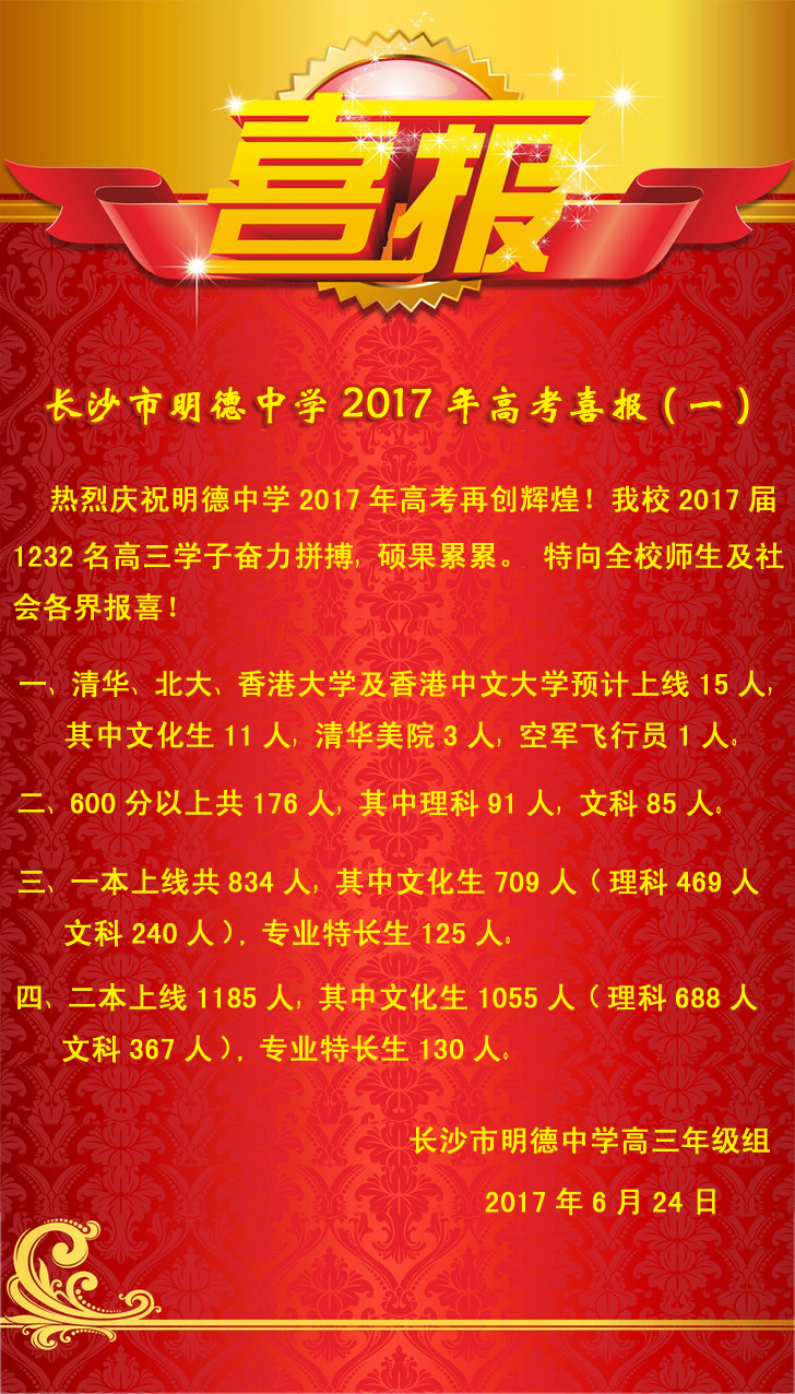 长沙市明德中学2017年高考喜报(一)