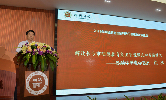 接下来,论坛由明德中学陶旅枫副校长主持。明德中学党委徐林书记首先解读了长沙市教育集团管理模式和发展措施,他结合学校制定出台的相关措施,对这些措施背后的理念、背景进行了详细解读,对一些重点条目进行了阐释。更加制度化、科学化的管理,将进一步推动明德教育集团的快速发展、转型升级。