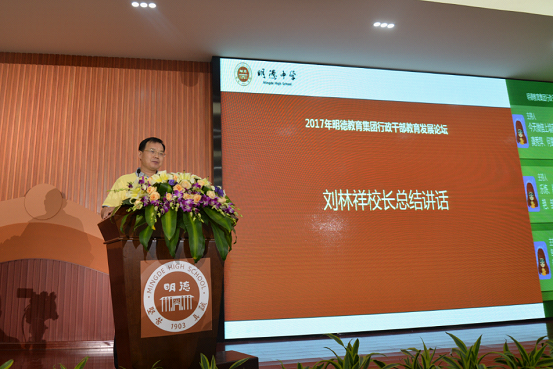最后,由明德教育集团的大家长、明德教育集团刘林祥校长做总结讲话。他语重心长,高瞻远瞩,站在引领整个明德教育集团发展的高度,指出“我们的集团管理模式和发展举措的完善,就是要形成机制体制的保障,这个机制体制凝聚了所有明德人的智慧,这样才能可持续发展”,对此次论坛、为什么要举办论坛、为什么要集团化办学、展望集团未来的发展,他都作了条理清晰、层次鲜明、不断深入的解读,他的演讲,层层深入,展现了一位校长的思想深度和勇于担当的精神。对于明德集团的发展,刘校长充满信心、满怀豪情,明德教育集团这一艘教育航母,必将驶向成功的彼岸。