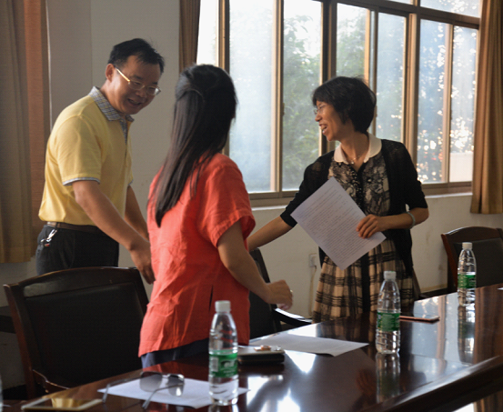 长沙市教育局党委委员、副局长缪雅琴与明德中学校长刘林祥亲切交谈