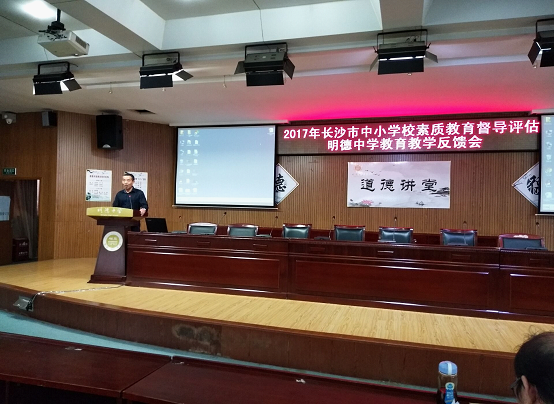 督导组首先在四箴堂三楼会议室查阅了学校各项材料,随后在学校领导陪同下开展随堂听课、学生实验考察,随机抽取学生、教师、家长进行问卷调查、电话访谈,并实地查看了我校大课间篮球操、运动员日常训练等学生活动。评估人员从发展规划、队伍建设、教育管理、发展绩效以及特色亮点等方面对学校实施素质教育工作进行了全面细致的考察。督导组还对督导听课及资料检查召开反馈会,我校教师积极参与,主动配合迎检工作的开展。反馈会上,督导组领导通报了他们在本次督导中的听课结果、座谈情况,并肯定了我?!拔幕⑿#厣煅А暗睦砟钗幕?,希望学校继续发扬注重学生素质全面培养的发展思路,在进一步加强管理的同时努力转型升级,把明德中学办成国内一流、国际知名、高质量、高品味、最受欢迎的湖湘名校。