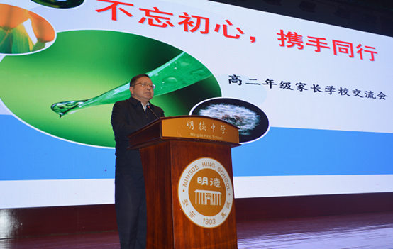 大会首先由高二年级组长吴永果老师做了题为《不忘初心,携手同行》的工作汇报,在报告中,吴老师介绍了本年级文、理分班后的基本情况,对本年级在高二开学以来的各方面情况进行了全面、系统地总结分析,对后段的工作规划和目标及具体安排做了详细的部署,对本年级的发展态势点燃了美好的希望。吴组长的报告图文并茂,生动详实,不时引来一阵阵热烈的掌声,让家长们对孩子当前学业情况和生活状况有一个全面的定了解和定位,为后期的学习和计划提供了很好的参考。