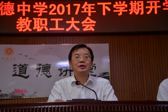 秋风破,战鼓响。下午,教职工大会拉开了新学期奋进的帷幕。首先,由明德中学校长刘林祥发表重要讲话。他充分肯定了我校在上学期包括教学、德育、教科研等方面取得的斐然成绩,并就暑期校园维修、党风廉洁、文明创建等各项工作总结发言;就2017-2018学年学校发展作整体规划,特别强调坚强有力的教师队伍建设是教育教学的根本保障;还就开学工作安排部署,并提出要达到文明、规范、安全、有序的标准。接下来,纪委书记周喜兰就纪检工作和师德师风建设提出严厉要求。她强调教师们要时刻检讨自己,规范从教行为,特别是关于教辅资料征订问题需引起警惕和重视;周书记带领教师们一齐学习了《长沙市中小学教师从业行为“十不准”》,鸣响思想警钟。随后,党委书记徐林带领全体教师认真学习关于清理国家公职人员参与涉矿等商业经营活动的相关文件,强调此次专项整治尤为重要,不得瞒报虚报迟报,要求消除侥幸、抵触等不良心理。最后,副校长伍卓林对本学期人事安排作部署,并对全体教职工提出了新学期工作要求,希望大家尽快从假期状态转换角色,恰当定位,凝心聚力,真抓实干,同心同德,再铸辉煌。