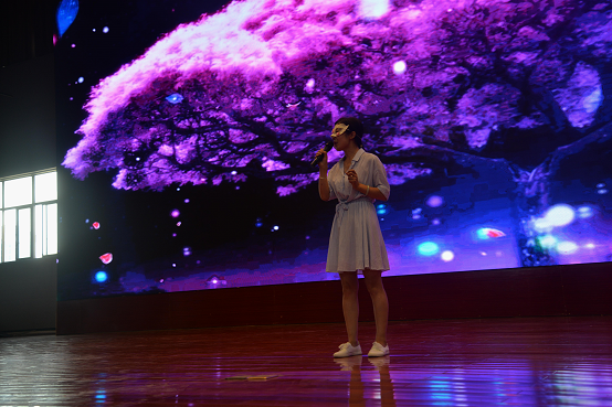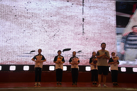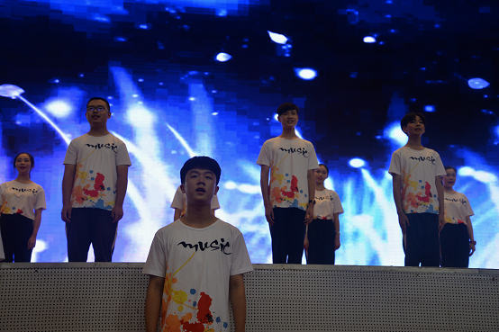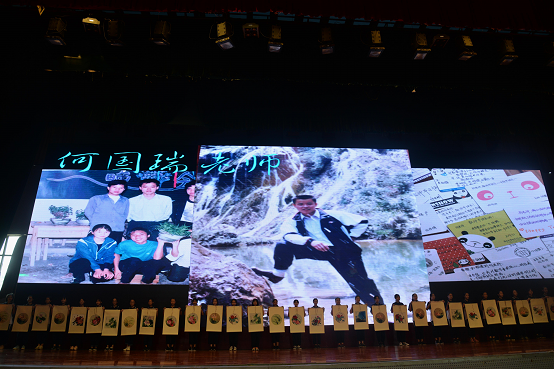 高二明星艺术班以歌曲《天之大》献礼教师节,拉开表彰大会的序幕。歌声绕梁,娓娓动听,此刻主持人带领全体学生齐喊一声:“老师,教师节快乐!”