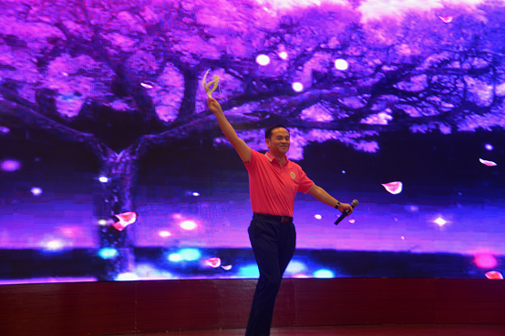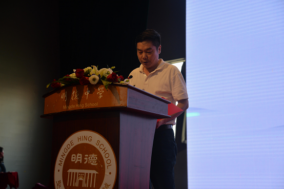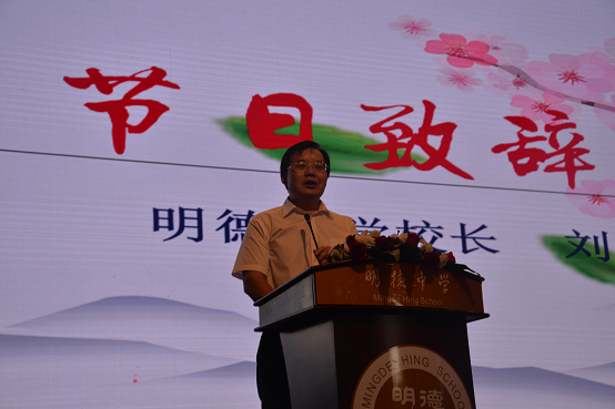 刘林祥校长发表了热情洋溢的节日致辞?!拔颐敲鞯率且凰按蟮难?,从胡元倓老校长创办起,就倡导‘磨血育人’的办学精神,涌现出一批又一批优秀的教师。我们今天明德老师继承传统,个个爱岗敬业,爱生如子,业务精湛,这既是我们在座同学的幸运,也是学校的光荣!”他强调了师道传承的重要性:“此刻我们邀请了五位曾经在明德求学,现在又回到母校教书的老师上台进行交流,就是想告诉大家,明德有这样一份薪火相传的传统, 恪守‘坚苦真诚’的砥砺前行,将通过我们每一位老师的三尺讲台,而影响我们的学生、传递给我们的学生。有一天,当学生们走向社会,甚至也成为老师,他们会成为具有明德情怀的真正‘明德人’!”随后,在中国新歌声录制现场准备比赛的新高三郭沁同学发来祝贺的视频,全场掌声如潮,经久不息。