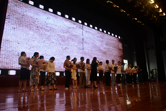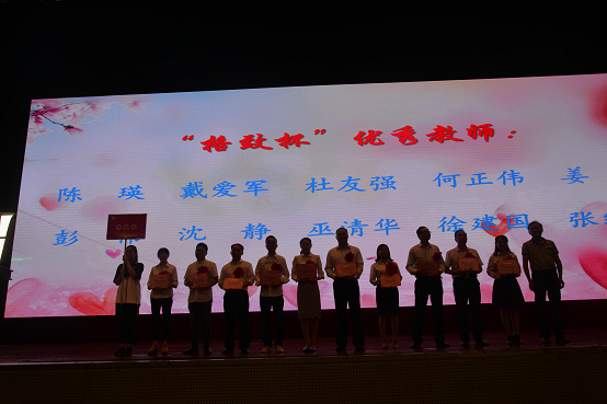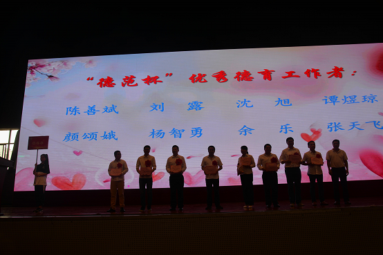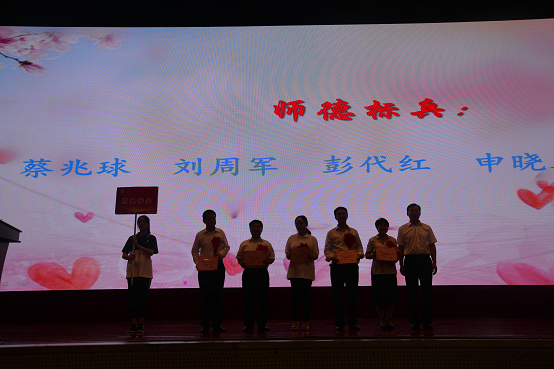 随着音乐班舞蹈《梦中的额吉》曼妙舞姿结束,进入了隆重的颁奖典礼。首先,为从教累计担任班主任15年及以上的老师颁发“桃李天下”从教纪念章。我校刘林祥校长也受此表彰。他动情地讲述:“给担任过15年及以上班主任的老师颁发奖章,很有意义。非常有幸,我也入选。这几天我一直在回味我的从教生涯,回想我的班主任经历。一直沉浸在无比的喜悦和幸福之中。我深深为我选择教育,为我能陪伴我的孩子们度过他们的美好青春,感到骄傲、自豪,我的职业因你们而幸福!”然后,我校党委书记徐林宣读表彰决定,依次对获得“长沙市教育系统先进个人和长沙市优秀教师”、明德“格致杯”、“德范杯”、“弘毅杯”、“知新杯”、“师德标兵”获奖教师进行表彰。获奖教师代表邓朝发老师进行发言,他提到明德同事间这份至情至性和彼此间相互砥砺的深厚情谊使得我们对明天永怀希望和期待,行在其中,更乐在其中。盛意拳拳,感莫可言,全体教师在纪委书记周喜兰的带领下进行庄严宣誓,铮铮誓言激荡着每一位明德人的心。