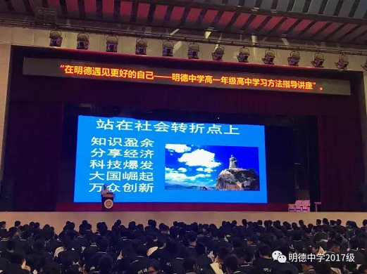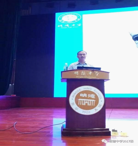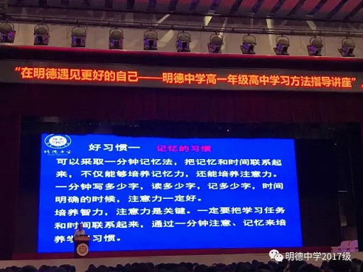 2017年9月18日下午,“在明德遇见更好的自己——明德中学新高一学习方法指导讲座”在怀求体育馆举行,由伍卓林副校长主讲。