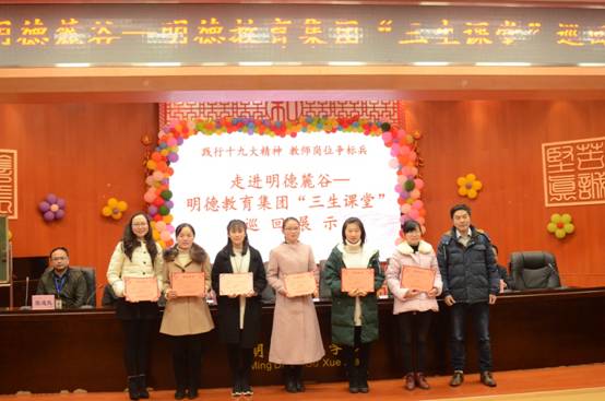 随后,所有老师聚汇明德麓谷学校报告厅,举行“三生课堂”巡回展示活动的总结表彰和颁奖仪式。明德麓谷学校校长陈迪夫对大家的到来表示热烈的欢迎,感谢大家积极参与本次展示活动。明德中学党委书记徐林给授课的六位老师颁发了证书,鼓励大家积极参与课堂研讨活动,不断提升教学素养。明德中学纪委书记周喜兰对本次活动进行了总结,赞扬明德麓谷学校筹划安排精细,赞扬赵洁、吴方玲、杨芸芸、郭珍艳、唐佩佩、彭助等六位授课老师,赞扬明德教育集团各位老师热心教研、不惧严寒的精神,并表示“三生课堂”巡回展示将及时总结这次活动成功的经验,一站一站办下去。