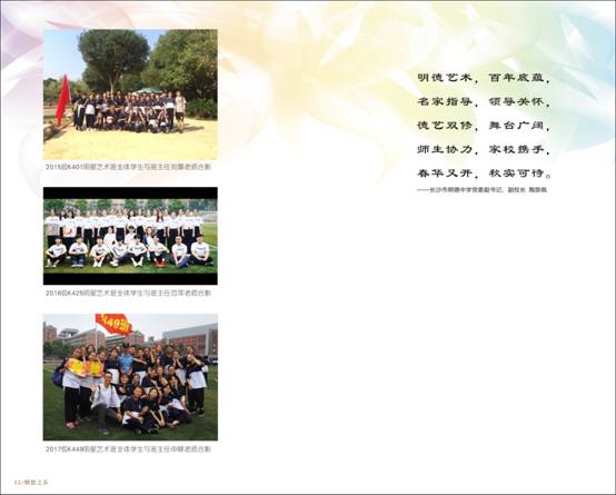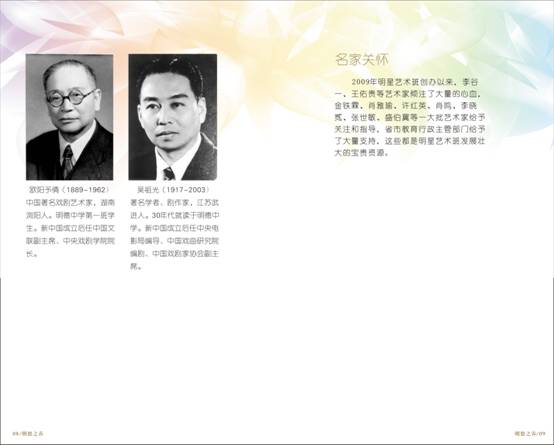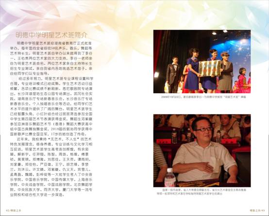 春华又开,秋实可待。明德中学明星艺术班2009年由李谷一老师亲自创办、命名,并经省教育厅批准每年面向全省招生,该班自成立以来,得到了社会各界的广泛关注和深切厚爱。