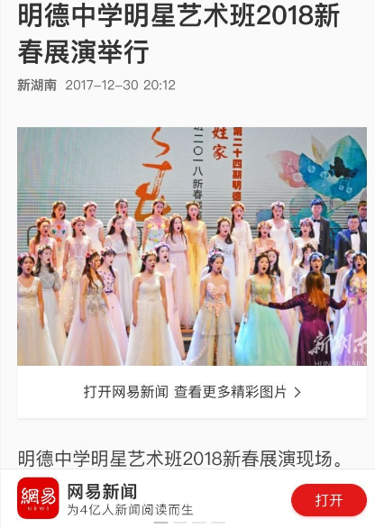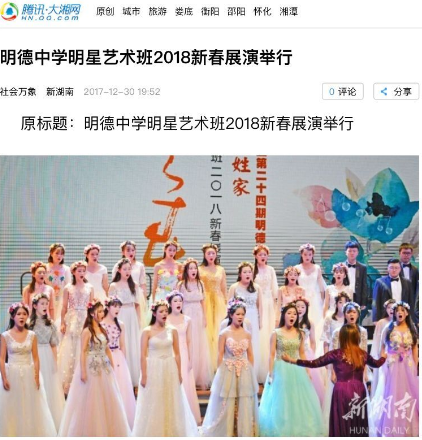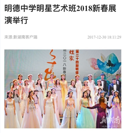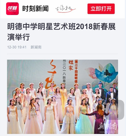 晚上18:11,展演活动结束才1个多小时,《湖南日报》的新媒体《新湖南》客户端即推出报道:“明德中学明星艺术班2018新春展演举行”。(网络链接:https://m.voc.com.cn/wxhn/article/201712/20171******811297769.html?from=singlemessage&isappinstalled=0)