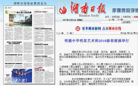 继12月30日《新湖南》网络报道后,《湖南日报》12月31日A02要闻版报道“明德中学明星艺术班2018新春展演举行”(链接:http://hnrb.voc.com.cn/hnrb_epaper/html/2017-12/31/content_1276653.htm?div=-1。)