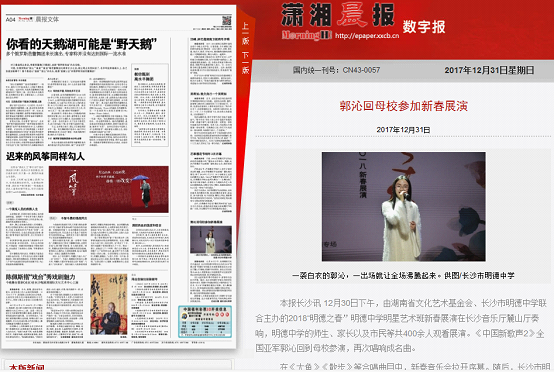 《潇湘晨报》12月31日A04版刊发图文新闻:“郭沁回母校参加新春展演”(链接:http://epaper.xxcb.cn/xxcba/html/2017-12/31/content_2948436.htm)