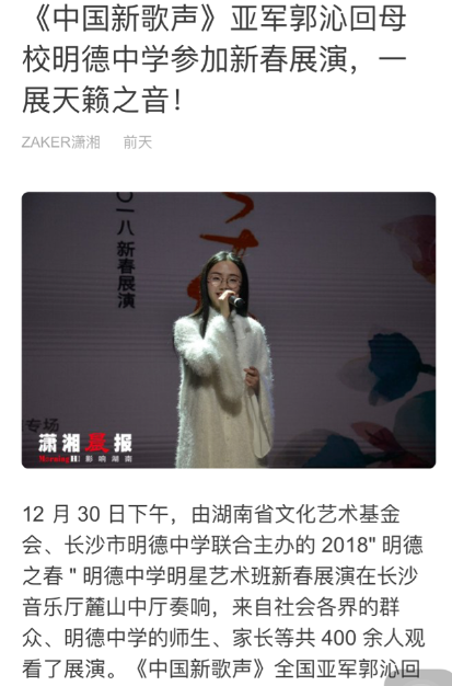 《潇湘晨报》早前的12月30日晚也推出了网络报道:《中国新歌声》亚军郭沁回母校明德中学参加新春展演,一展天籁之音?。唇樱?/span>https://app.myzaker.com/news/article.php?pk=5a4783ed1bc8e0634100009a&from=singlemessage&isappinstalled=0)