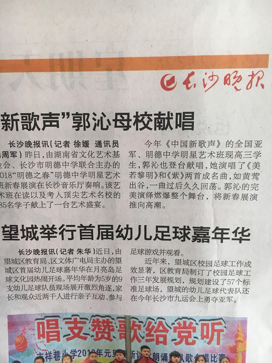 长沙晚报2017年12月31日A08版《“新歌声”郭沁母校献唱》