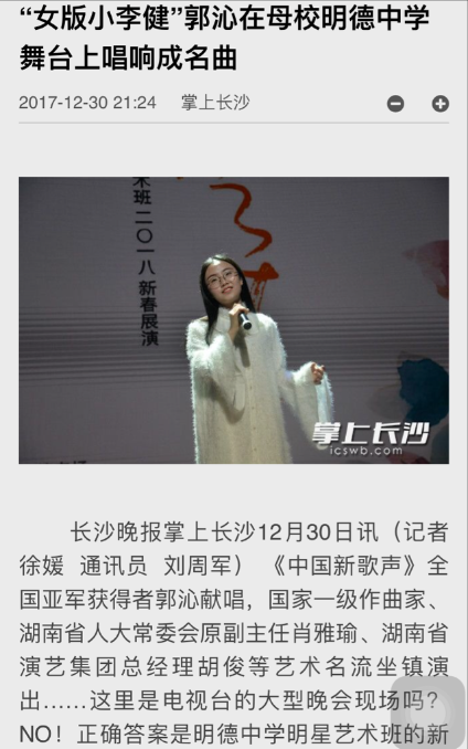 长沙晚报《掌上长沙》2017-12-30 21:24“女版小李健”郭沁在母校明德中学舞台上唱响成名曲