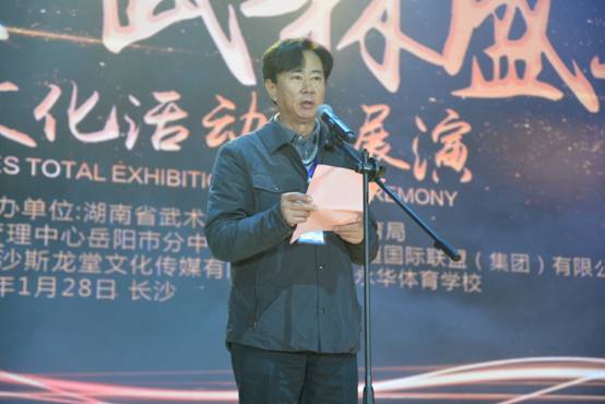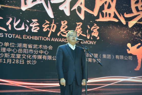 开幕式正式启动,明德中学校长刘林祥致欢迎词,他表示明德中学有着百年悠久历史,历来重视体育发展,其文化精神与武术文化一脉相承,此次武术盛典在明德中学举办是全体明德人的荣幸。随后李舜做了题为“办武林盛典 扬湖湘武魂”讲话。他说:“此次由湖南省体育局主办,湖南省武术协会承办,长沙市明德中学协办的湖南省武术文化展演活动,历时三个多月,先后在我省武术之乡新化县、麻阳县、浏阳市、东安县、衡东县等地进行系列展演活动,共展演武术文化节目近百个,参加节目演出人员三千多人?!彼婧螅泄涫跞儆硕?、省文联主席欧阳斌先生宣布总展演开幕。
