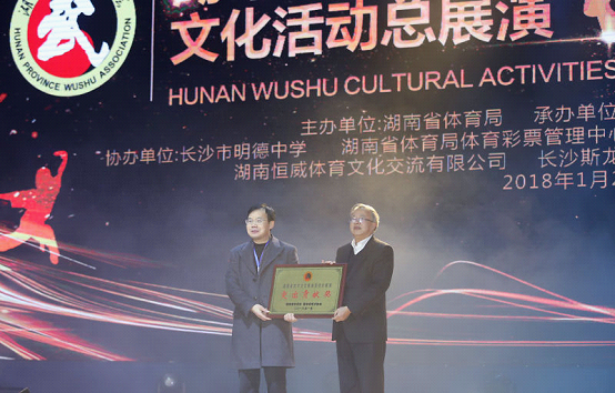 湖湘武林,明德盛典。明德中学作为协办单位,大力支持活动开展,欧阳斌先生为明德中学颁发了“突出贡献奖”,由刘林祥校长登台领奖。此次展演活动不仅传承了湖湘武术文化,带动了武术事业发展,还推动了明德体育教育蓬勃发展。