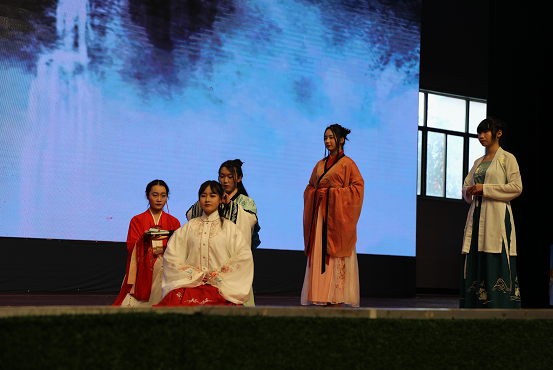古琴声幽幽,几位明德中学青衿社的社员宽袍缓带,古意盎然。他们神色庄重,走上舞台,给大家表演古代的笈礼和冠礼。随着琴声的节奏,他们一举一动舒缓从容,演绎出古代礼仪的种种程序,展示出古人的礼仪背后的庄重和谨严。