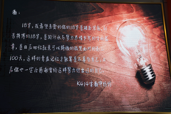 说不尽的还是父母对孩子的关爱。405班黄文倩父母信中写道:“爸妈要告诉你,各自的路,各自的人生,不同的选择!不管你在哪里,不管你多大,不管你将来的人生是灿烂辉煌还是暗淡平凡,我们都永远和你站在一起!”