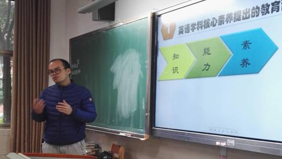 首先登场的是英语组不仅拥有诗人般浪漫情怀而又风趣幽默的伍初辉老师。伍老师虽然很年轻,但在教学上深刻钻研,教学过程和教学方法都很有自己的思想和特色,早已成为明德英语组的骨干老师。伍老师通过对英语学科核心素养的深入研究,结合自己的教学过程中的具体案例,阐析了自己对于英语学科素养的独特见解。