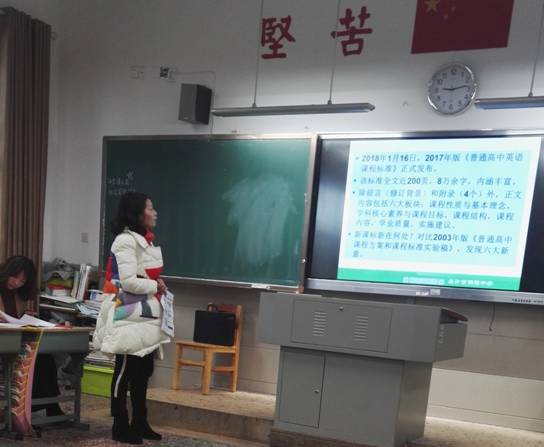 接下来发言的是我们英语组女神级别的喻新辉老师。多年的高三教学经验,让喻老师对高中英语课程标准有着深刻地研究。喻老师从课程性质与基本理念,英语学科核心素养与课程目标,课程结构,课程内容和学业质量五个方面对新旧英语课程标准做出了对比分析和探讨,为全组的英语老师点亮了明灯。