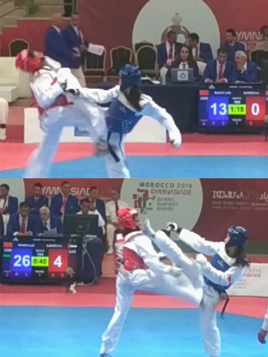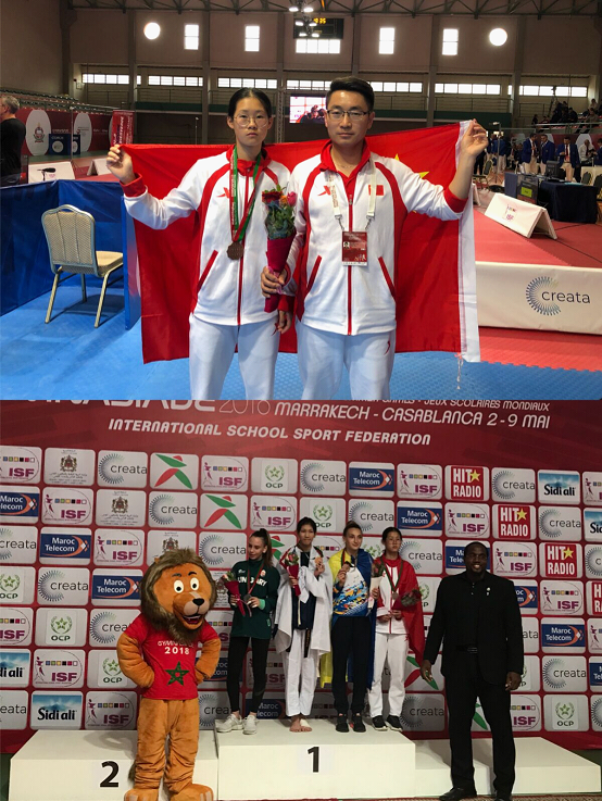 2018世界中学生运动会于5月1日至10日在非洲摩洛哥马拉喀什举行,本次比赛共有来自57个国家的3500名运动员参赛,中国代表团派出了157名运动名参加了10个项目的比赛,共取得12枚金牌、11枚银牌、18枚铜牌。经中国体育协会的选拔,我校跆拳道队罗妙溢以第一名的成绩入选中国中学生跆拳道队,南京育张舒教练我校王焰钢教练入选本次比赛教练组,代表中国出征参赛。