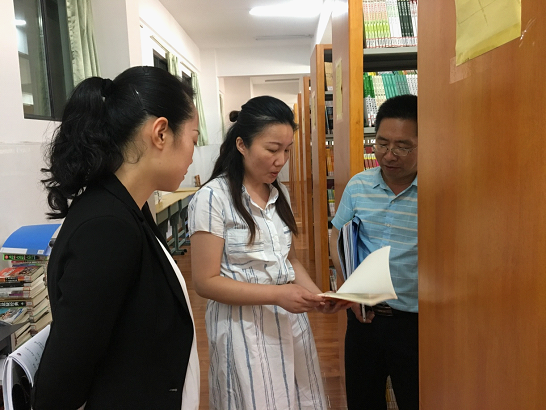 调研工作小组在行政会议室召开了专项调研督导会?;嵘希揭毙3は晗噶私樯芰搜5耐际楣?、阅览室以及班级图书角等建设情况、优秀传统文化教育和学校文化建设等实施情况、文明校园创建等情况,语文教研组长胡立亚具体介绍了语文阅读课的设置和教学效果等情况,包括学生“共读一本书”、明德天心中学首届诗词大会初赛和复赛、给未来30年的自己一封信等,展示了读书活动一系列成果,刘周军主任和陈良玉馆长对学校举办的丰富多彩的读书活动和浓郁的书香氛围表示高度的认可和赞扬。随后,冉银莎副校长陪同参观了学校阅览室和书吧,介绍了学校各年级阅读参考书目的藏书量等情况。