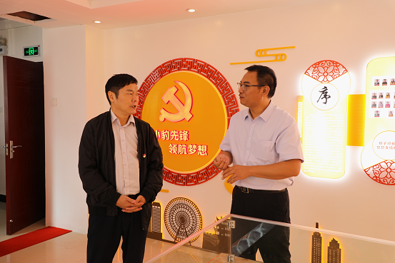 参观社区党建活动室(图右:长沙市天心区新开铺街道豹子岭党总支书记范海波,图左:明德中学党委书记徐林)