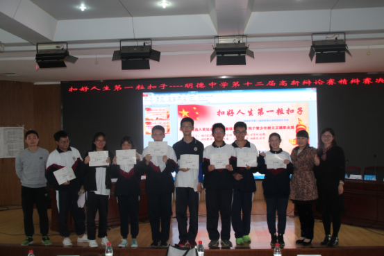 在刘艳玲老师宣读结果后,现场进行了颁奖仪式,至此,明德中学第十二届个人精英辩论赛圆满落幕。本次辩论赛,我们看到的不仅是团委学生会工作人员的尽心尽力,细致入微,同样地,我们欣赏到了明德学子的正气凛然,学识丰厚,思维敏捷。衷心祝贺各获奖选手,希望他们在文化学习及传承上,激励到更多的同学,乃至国家,乃至社会!我们也将坚守明德忠坚苦真诚的伟大校训,乘风破浪,在知识学习和素养砺练中,提升自我价值,向中华民族的伟大复兴而进发!