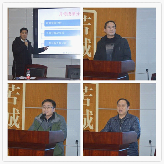 教务处卢朝为副主任分析数据、吴永果组长指出教学和教育管理中存在的问题和不足,并对后段工作作安排、2018届理综备课组长彭云武老师、文综备课组长杜友强老师作备考经验交流。