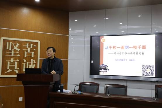 会上最发人深省的环节便是明德教育集团总校长刘林祥发表的主题为“从千校一面到一校千面”的精彩讲座。刘林祥校长立足“新时代、新教育”大背景,强调明德教育集团下的各学校要在注入明德文化基因的基础上发展出各自的特色,进而用特色化推动高质量发展。刘林祥校长在讲座中还特别提炼出明德中学办学的最大特色——“一核六翼”的人才培养模式,即以“明德树人”为核心,以治理统整资源、文化滋养生命、课程搭建平台、师资构筑底座、评价促进发展、特色点亮未来为六翼,实现师生双主体的发展与幸福,形成一校千面(让学生全面而有个性地自由发展)的教育新局面。