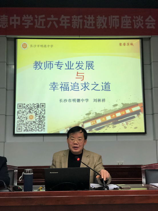 最后,刘林祥校长做《教师专业发展与幸福追求之道》微讲座,希望在见证大家成为明德人的同时,进一步见证老师们的成长。他提出“越专业越幸?!钡墓鄣恪霸阶ㄒ怠敝荚谧觥白ㄒ敌汀苯淌?,讲求“四有”(有理想信念、有道德情操、有扎实学识、有仁爱之心);“越幸?!敝荚谧觥靶腋P汀苯淌Γ睬蟆拔搴谩保ň衩婷埠?、身体状况好、日常生活好、师生关系好、教学效果好。)他希望老师们进一步践行明德中学的“三生课堂”,在教学中让生命出彩、让课堂出俗、让学生出场、让教师出众、让学校出色、让集团出新。学校将继续帮助教师制订专业发展规划、实施专业发展策略,推动教师专业发展;从教学评价、党建育人、民主治校、文化氛围、工作环境、团队建设、工会履职、师生关系等方面助力教师追求人生幸福。在全校教职员工的共同努力下,明德学校名师团队蔚然有成,后起之秀青蓝相接,学生成长不忘师恩,社会赞誉校兴我荣。事实证明,越专业就越能获得认可和尊敬,就越能体验到教师职业的幸福。最后刘校寄语与会教师“教育,是缔造幸福的事业。你的第一责任是使自己幸福。你自己幸福,你也就能使别人幸福。”刘校长的一番话让大家进一步感受到了学校领导的殷殷期盼与真切关怀,对未来发展更添勇气与信心。