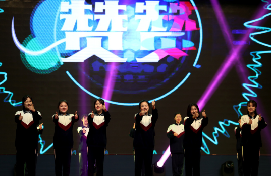 (图为明德学子与奥运冠军龚智超、龙清泉一起表演“赞赞体育新时代”手势舞。)